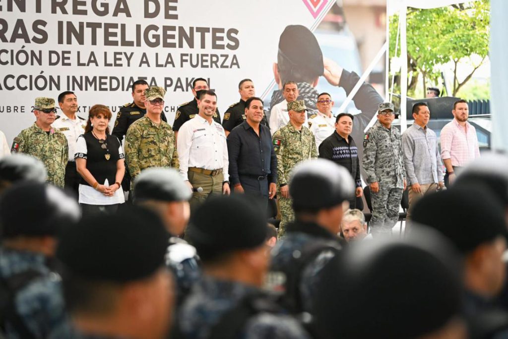 Durante la entrega de cámaras inteligentes y vehículos blindados a la Fuerza de Reacción Inmediata Pakal (FRIP), el gobernador Eduardo Ramírez Aguilar destacó que la seguridad es una de las principales prioridades del gobierno de la Nueva ERA, por lo que se ha realizado una importante inversión en equipamiento, unidades terrestres y aéreas, herramientas tecnológicas e inteligencia operativa, con el objetivo de contar con una policía preparada y altamente profesional al servicio del pueblo de Chiapas.
