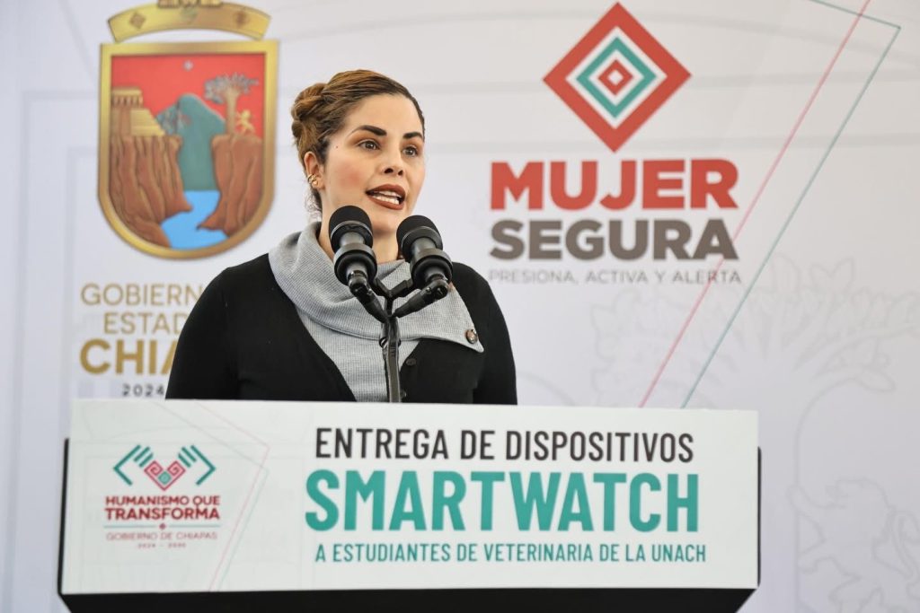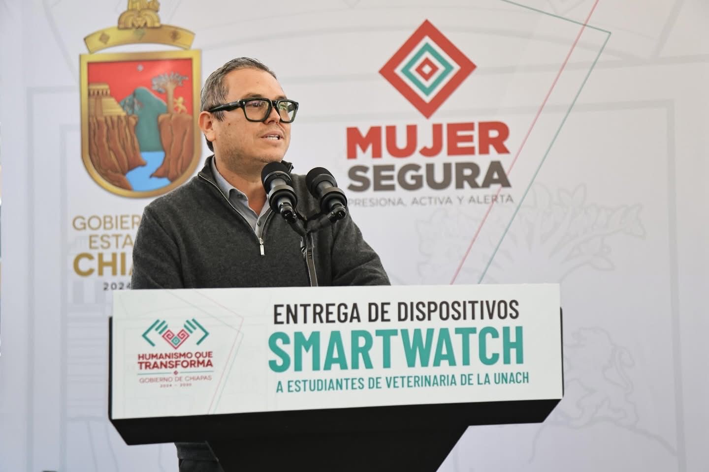 El gobernador Eduardo Ramírez Aguilar encabezó la entrega de dispositivos smartwatch del programa Mujer Segura: Presiona, Activa y Alerta a estudiantes de la Escuela de Medicina Veterinaria y Zootecnia de la Benemérita Universidad Autónoma de Chiapas (Unach), en Tuxtla Gutiérrez. En ese marco, destacó que una de las prioridades del gobierno de la Nueva ERA es garantizar el bienestar, la seguridad, la confianza y el derecho de las mujeres a una vida libre de violencia.