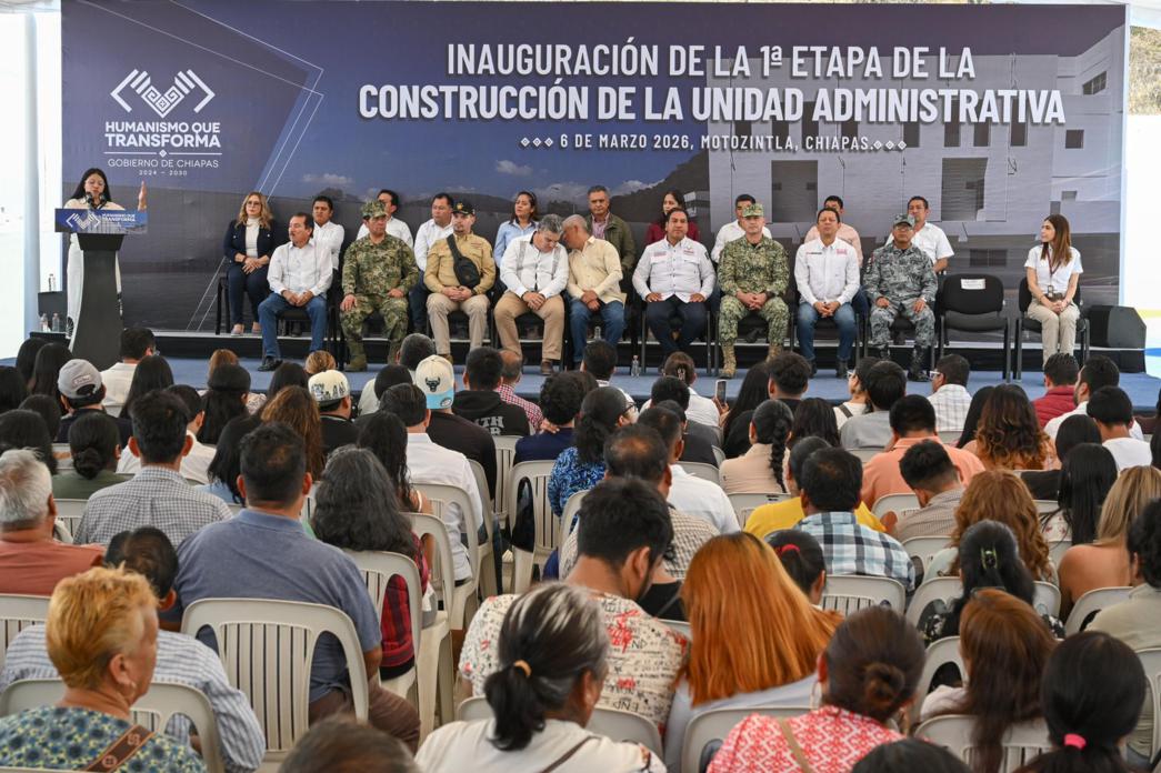 El gobernador Eduardo Ramírez Aguilar inauguró la primera etapa de la construcción de la Unidad Administrativa en el municipio de Motozintla, una infraestructura moderna que albergará de manera digna y funcional a la Fiscalía de Distrito Sierra Mariscal y a la Secretaría de Seguridad del Pueblo. Este espacio permitirá fortalecer la gobernabilidad y el Estado de derecho, además de agilizar la atención de las necesidades de la región Sierra Mariscal.