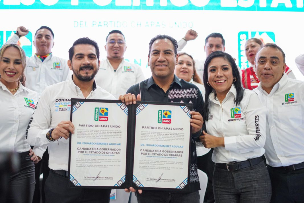 En sesión solemne ordinaria del Consejo Político Estatal del Partido Chiapas Unido, el presidente del partido, Conrado Cifuentes Astudillo entregó la constancia que ratifica a Eduardo Ramírez Aguilar como candidato a la gubernatura del estado de Chiapas para el periodo 2024-2030.