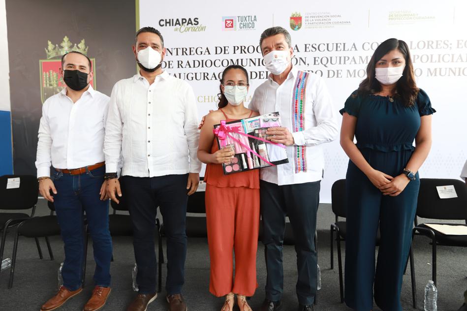 En el municipio de Tuxtla Chico, el gobernador Rutilio Escandón Cadenas encabezó la entrega de apoyos del Programa “Escuela con Valores”, radios de telecomunicación y equipamiento policial, y realizó la inauguración del Centro de Monitoreo y Videovigilancia, donde subrayó que para su gobierno la seguridad es uno de los pasos fundamentales para el desarrollo económico de Chiapas.