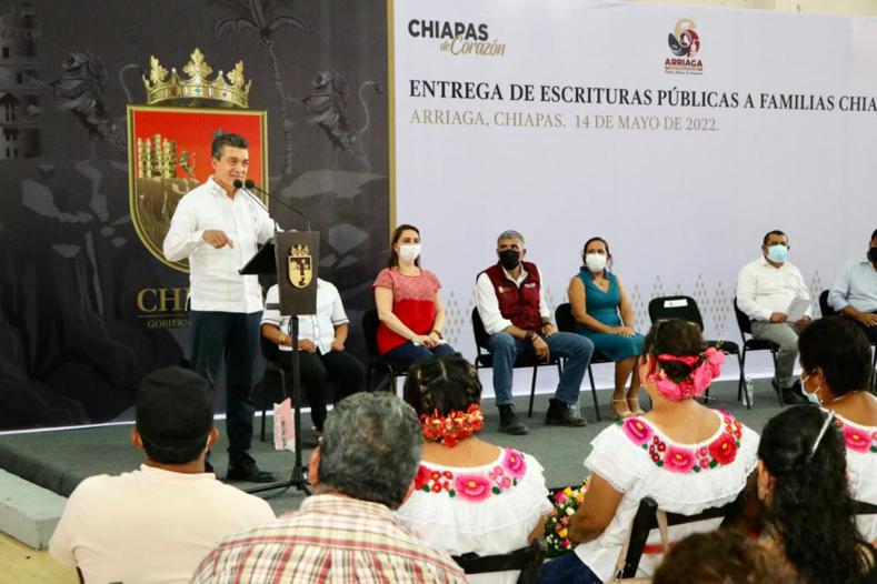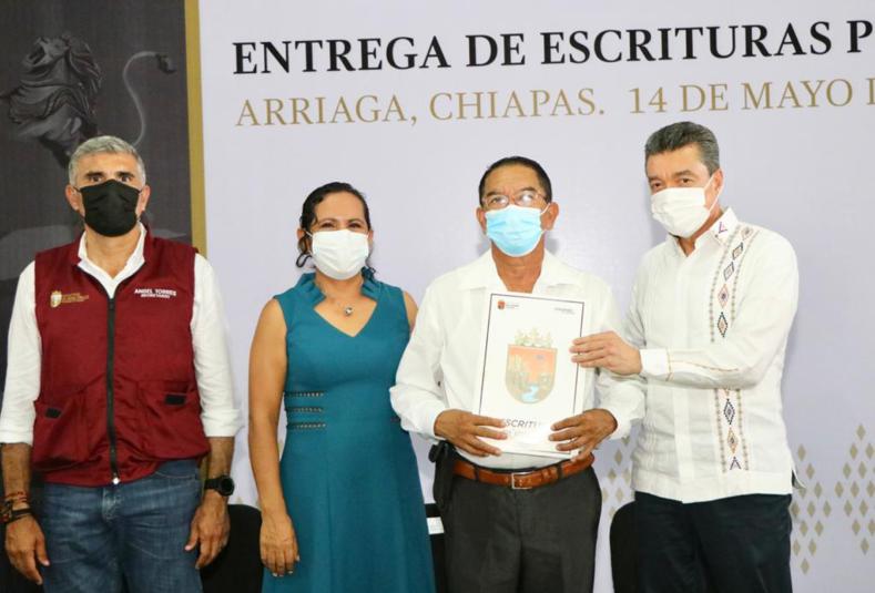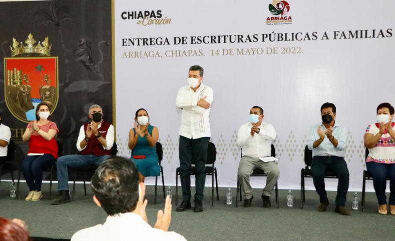 En otro momento, el mandatario encabezó la entrega de escrituras públicas en beneficio de familias de la colonia Vivah Universitario del municipio de Arriaga; de la colonia Quinta Anita, de Tonalá; y Las Garzas, de Cintalapa, donde destacó que además de brindar justicia social, así como seguridad jurídica y patrimonial a las familias, con este acto su gobierno da cumplimiento al derecho humano de las chiapanecas y los chiapanecos, de garantizar el acceso a una vivienda digna.