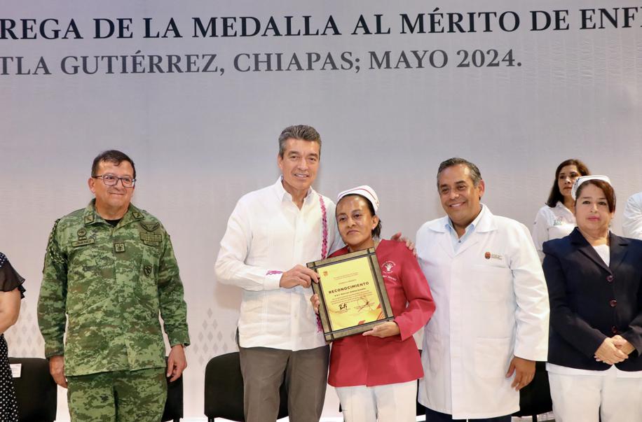 Este martes, el gobernador Rutilio Escandón Cadenas encabezó la entrega de la Medalla al Mérito de Enfermería Chiapas 2024 a la enfermera Martha Lilia Hernández Ramírez, donde sostuvo que en Chiapas, las enfermeras y los enfermeros han sido verdaderos ángeles de batas blancas, porque todos los días auxilian y cuidan de la salud de todas y todos, sin distinción.