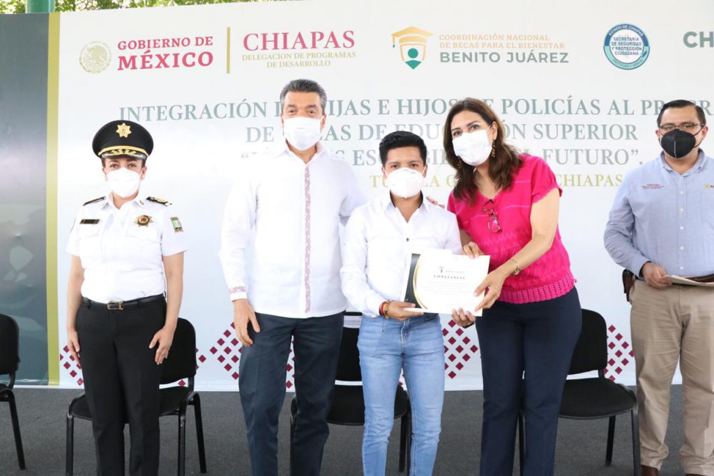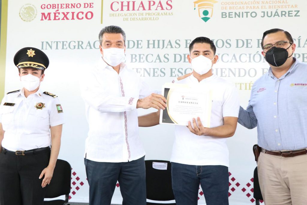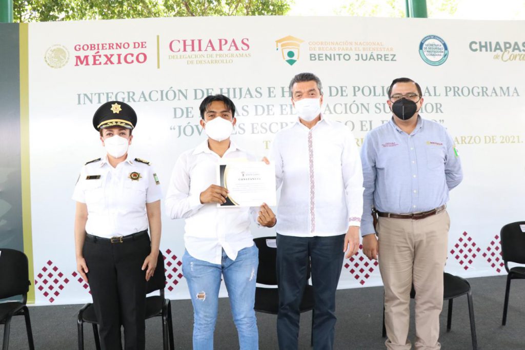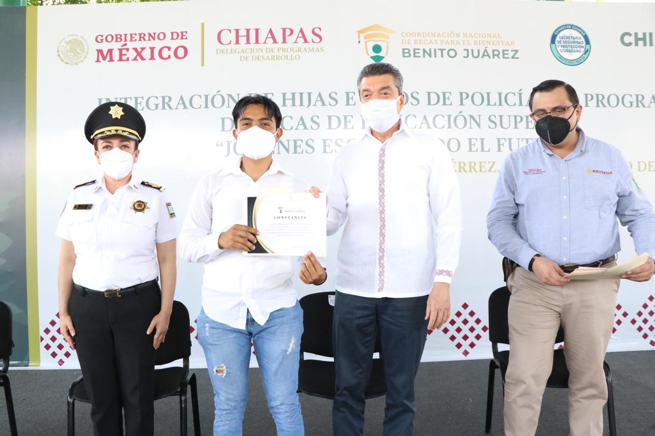 Al encabezar el evento de integración de hijas e hijos de policías al Programa de Becas de Educación Superior “Jóvenes Escribiendo el Futuro”, el gobernador Rutilio Escandón Cadenas subrayó la labor que las mujeres y hombres policías realizan a favor de Chiapas, y la importancia de garantizar un mayor bienestar a sus familias, apoyando a la juventud con esta iniciativa para que alcance sus aspiraciones y participe del progreso de la entidad.