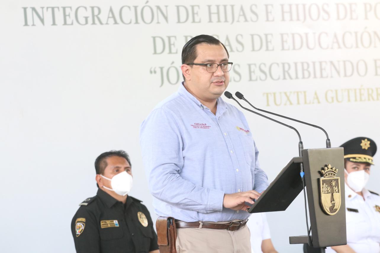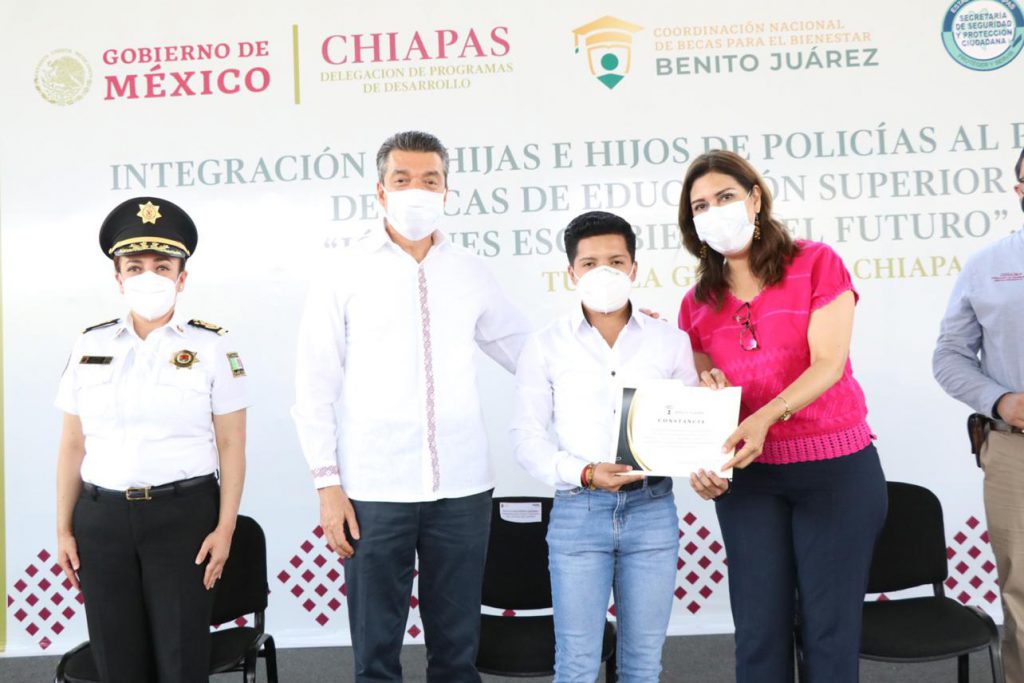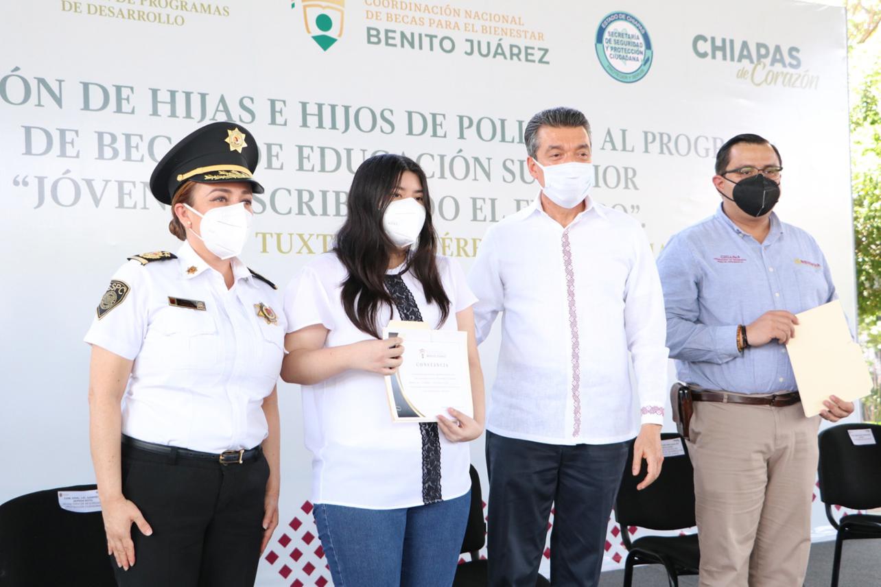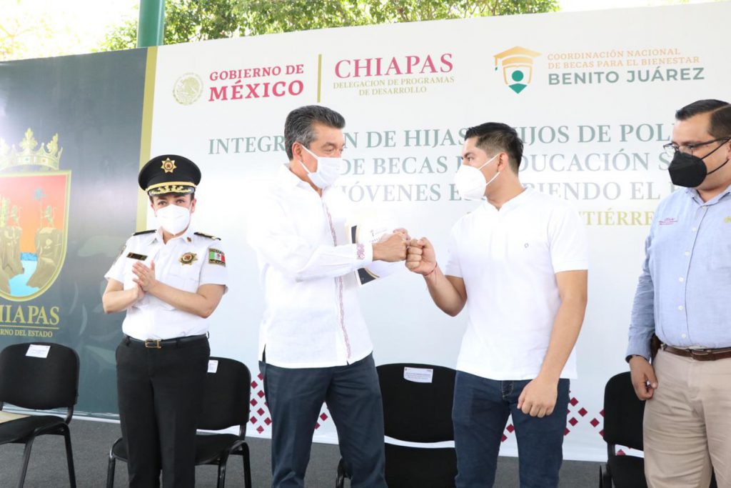 Al encabezar el evento de integración de hijas e hijos de policías al Programa de Becas de Educación Superior “Jóvenes Escribiendo el Futuro”, el gobernador Rutilio Escandón Cadenas subrayó la labor que las mujeres y hombres policías realizan a favor de Chiapas, y la importancia de garantizar un mayor bienestar a sus familias, apoyando a la juventud con esta iniciativa para que alcance sus aspiraciones y participe del progreso de la entidad.