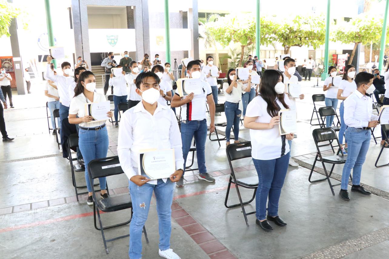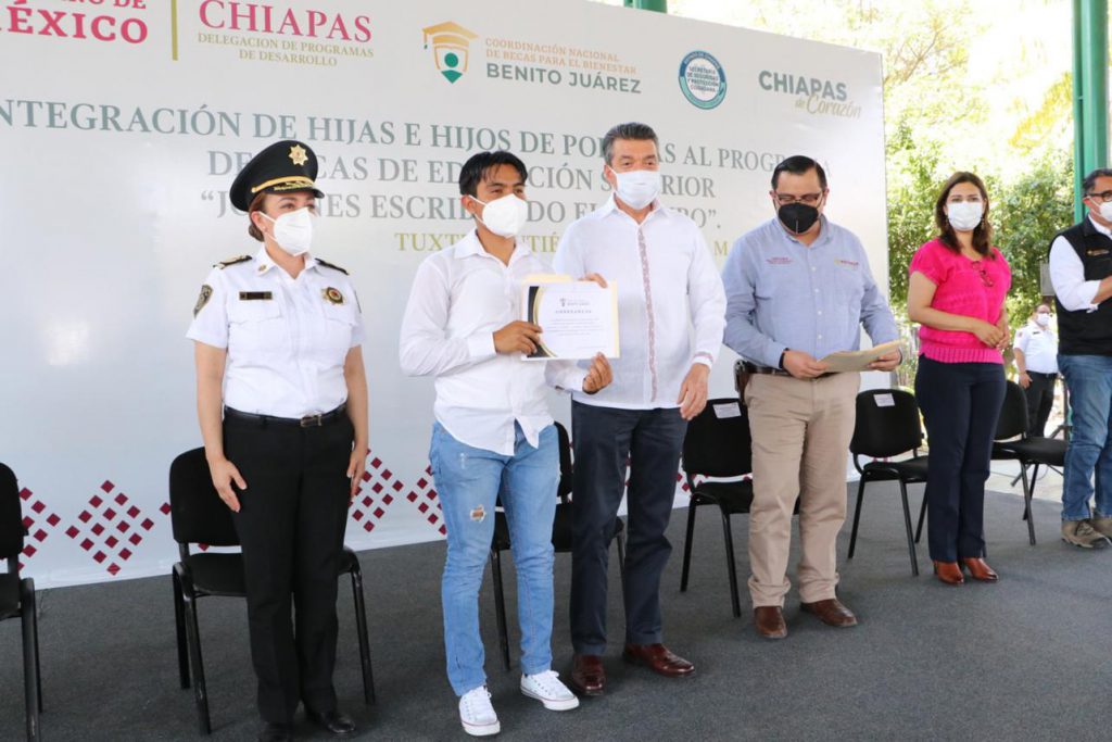 Estuvieron presentes: la secretaria de Educación, Rosa Aidé Domínguez Ochoa; el titular de la Oficina de Representación de la Coordinación Nacional de Becas para el Bienestar “Benito Juárez” en Chiapas, Jesús Ernesto Gómez Pananá; el inspector Marco Antonio Méndez Balcázar, padre de uno de los becarios; así como las y los jóvenes beneficiados, entre otros.