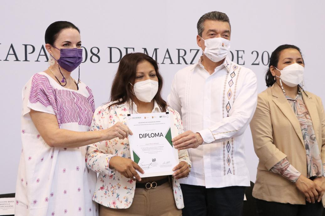 Durante este acto se entregaron constancias de los diplomados Gestión y Empoderamiento Político; y en Planeación e Implementación de Políticas de Igualdad a titulares de las Instancias Municipales de la Mujer.