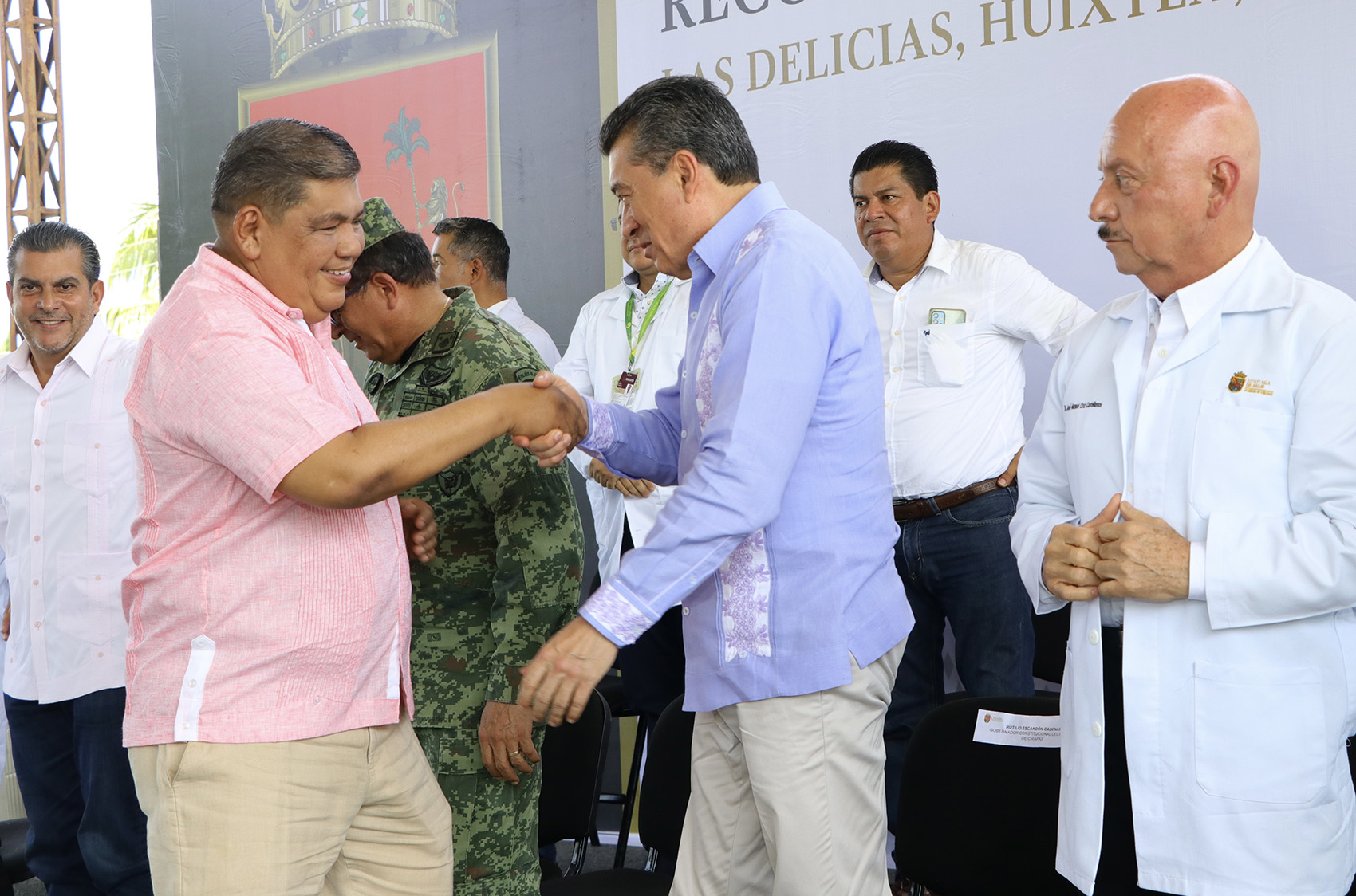 Estuvieron presentes: el comandante de la 36 Zona Militar, José Joaquín Jiménez Cueto; el diputado presidente de la Junta de Coordinación Política del Congreso del Estado, Aarón Yamil Melgar Bravo; la directora del Centro de Salud Las Delicias, Victoria Ashanti Macías Nava; el director general del Instituto de Seguridad Social de los Trabajadores del Estado de Chiapas (Isstech), Marco Antonio Ordóñez Juárez; el director general del Centro Regional de Alta Especialidad, Rafael Heberto Guillén Villatoro.