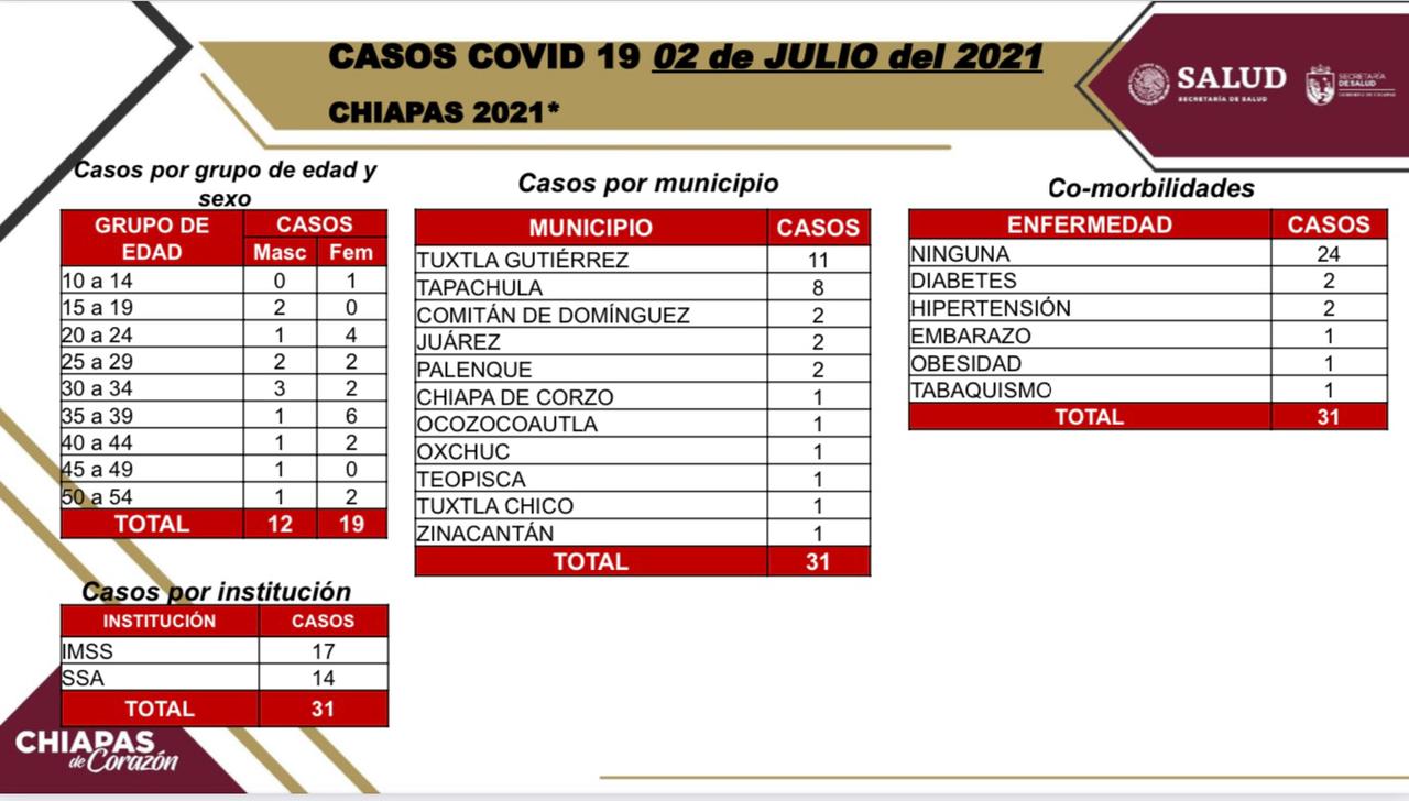 Tuxtla Gutiérrez, Chiapas; 02 de julio de 2021.- En las últimas horas, el Laboratorio Estatal de Salud Pública confirmó 31 casos positivos de COVID-19, de los cuales tres son pacientes cuya edad oscila entre los 10 y 19 años.