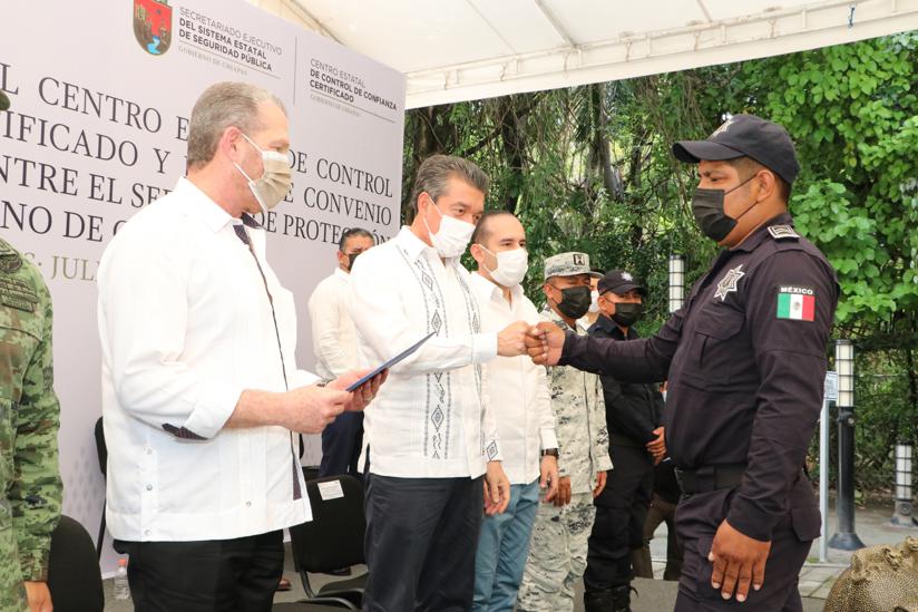 Detalló que los municipios que cuentan con la certificación única policial son Ocosingo, San Cristóbal de Las Casas, Tapachula, Tuxtla Gutiérrez, Villaflores, Tonalá, Salto de Agua, Tumbalá, Palenque, Las Margaritas, Comitán de Domínguez y Chiapa de Corzo. En tanto, que la Fiscalía General del Estado lleva un 98 por ciento, la Secretaría de Seguridad y Protección Ciudadana un 89 por ciento y la Policía de Reinserción o Custodios de los Ceresos un 86 por ciento, además se van a contratar 7 mil plazas para protección federal.