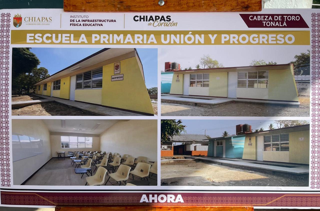 Al inaugurar la reconstrucción de espacios en la Escuela Primaria “Unión y Progreso”, en Cabeza de Toro, Tonalá, junto a niñas y niños de este plantel, el gobernador Rutilio Escandón Cadenas subrayó que las escuelas son el mejor lugar para estudiar, aprender y ennoblecer el espíritu, por ello, se impulsan acciones que ofrezcan estancias educativas dignas en todo el estado.