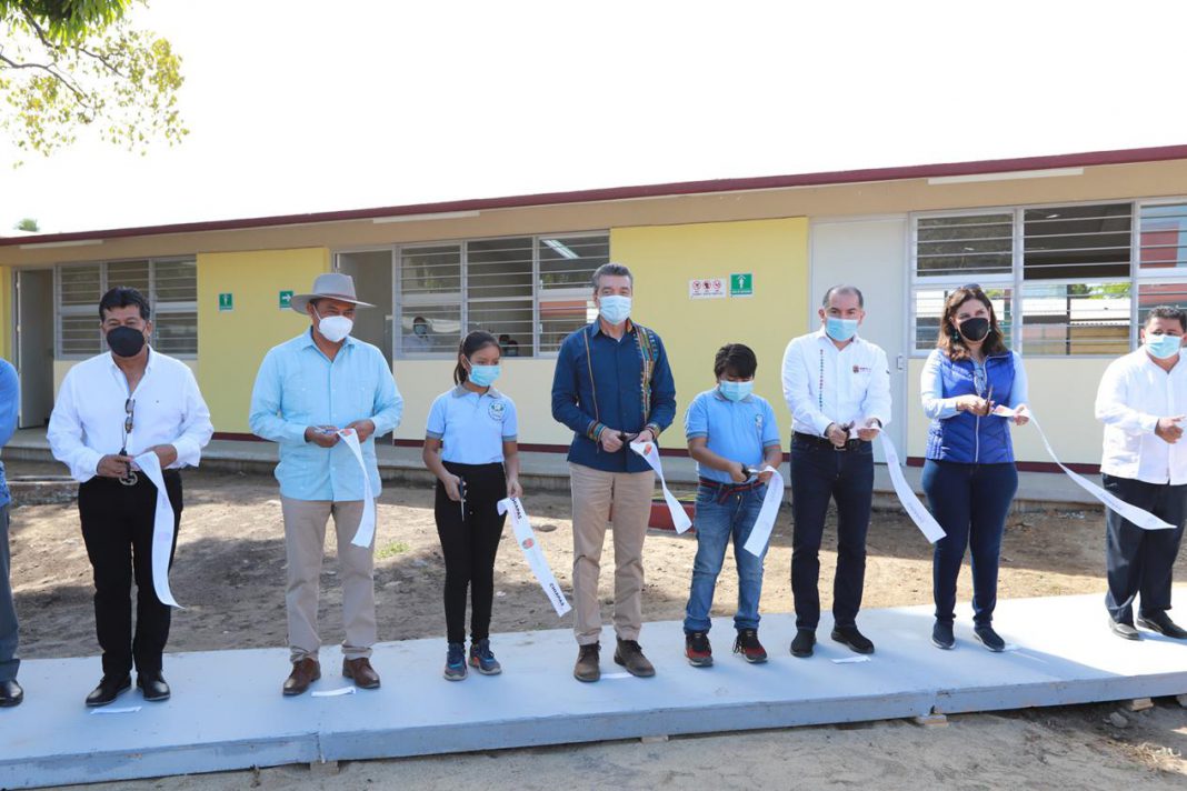 •          El gobernador entregó seis aulas didácticas y módulos sanitarios, con un monto de inversión de 3.09 mdp; en este municipio están en proceso 12 escuelas más