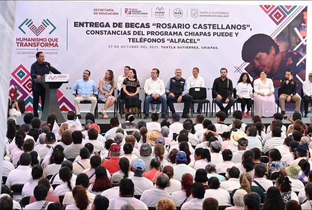 Durante la entrega de becas de alfabetización Rosario Castellanos, constancias del programa Chiapas Puede y celulares Alfacel, el gobernador Eduardo Ramírez Aguilar destacó que uno de los propósitos del gobierno de la Nueva ERA es fortalecer la educación. Enfatizó que se trabaja en unidad para que más personas aprendan a leer y escribir, con la meta de alzar bandera blanca como símbolo de que Chiapas ha vencido en la lucha contra la ignorancia.