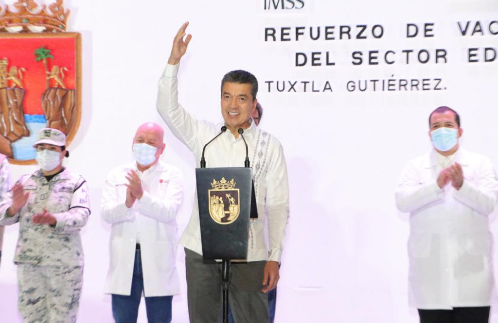 Luego de enviar un abrazo y expresar su solidaridad y afecto al presidente de la República, Andrés Manuel López Obrador, a quien le deseó mucha fuerza y pronta recuperación ante el COVID-19, el mandatario subrayó que el Gobierno de Chiapas es un aliado de la implementación de las políticas públicas que impulsa el Gobierno Federal, sobre todo ahora, con el inicio de estas acciones de vacunación de refuerzo al sector educativo.