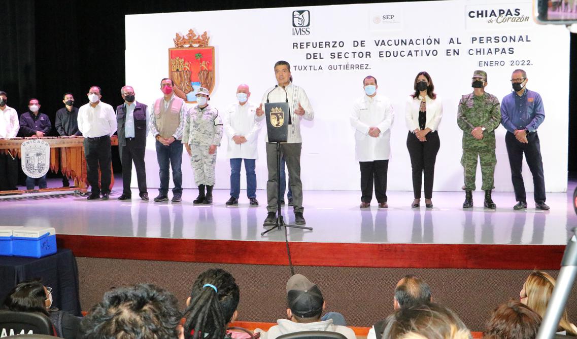Luego de enviar un abrazo y expresar su solidaridad y afecto al presidente de la República, Andrés Manuel López Obrador, a quien le deseó mucha fuerza y pronta recuperación ante el COVID-19, el mandatario subrayó que el Gobierno de Chiapas es un aliado de la implementación de las políticas públicas que impulsa el Gobierno Federal, sobre todo ahora, con el inicio de estas acciones de vacunación de refuerzo al sector educativo.