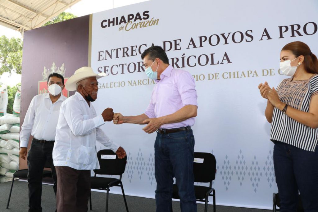 Desde el ejido Galecio Narcía, del municipio de Chiapa de Corzo, el gobernador Rutilio Escandón Cadenas encabezó la entrega de apoyos para impulsar al sector agrícola, donde rerendó el compromiso de su gobierno de seguir impulsando una política social alineada al Plan Nacional de Desarrollo y orientada a que las mujeres y hombres del campo tengan la posibilidad de producir más, con el fin de abonar al bienestar, desarrollo y progreso de las familias chiapanecas.