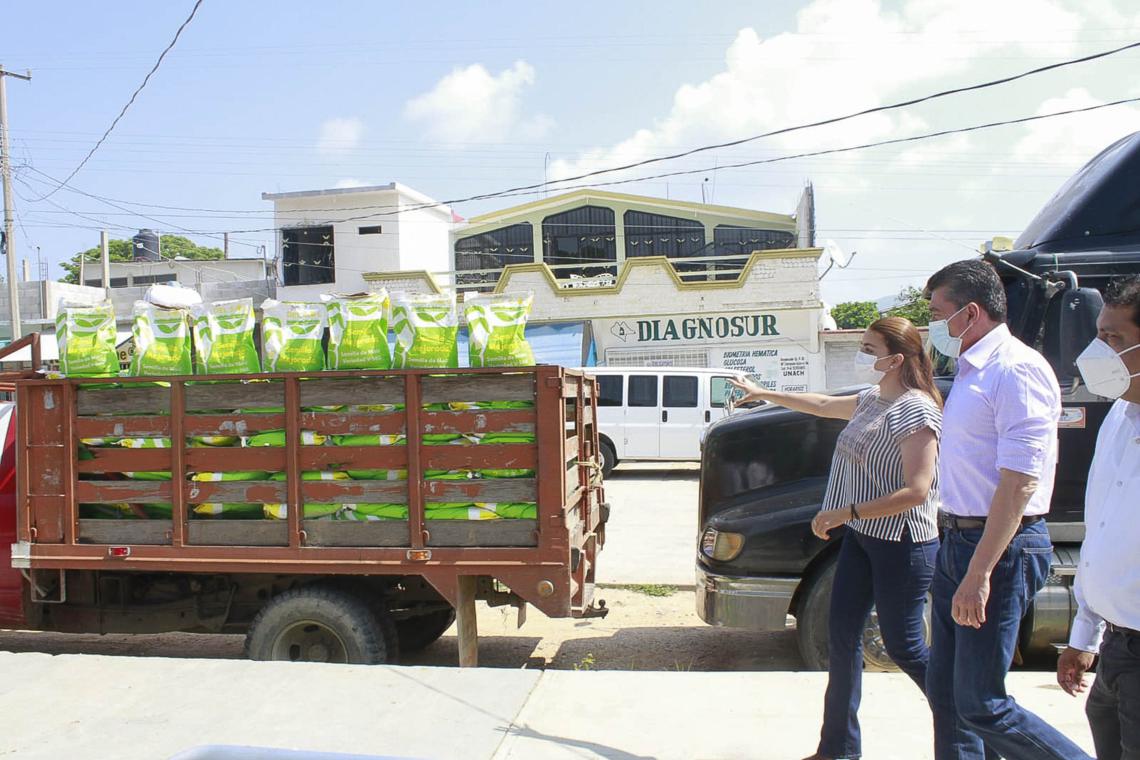 En su intervención, la secretaria de Agricultura, Ganadería y Pesca, Zaynia Andrea Gil Vázquez, subrayó que estos paquetes tecnológicos consisten en mil 773 Paquetes de Fertilizante del Proyecto Fortalecimiento a la Producción de Maíz en Tiempo de Siembra 2021; 500 bolsas de Semillas del Proyecto Maíz de Corazón, Seguridad Alimentaria 2021; así como 3 mil árboles frutales de mango, chicozapote, limón persa, nance y guanábana.