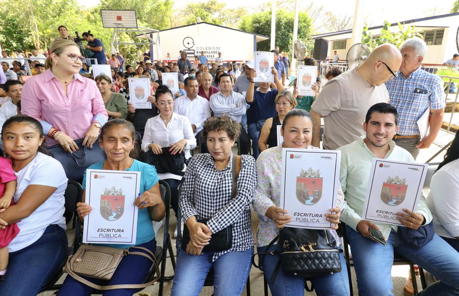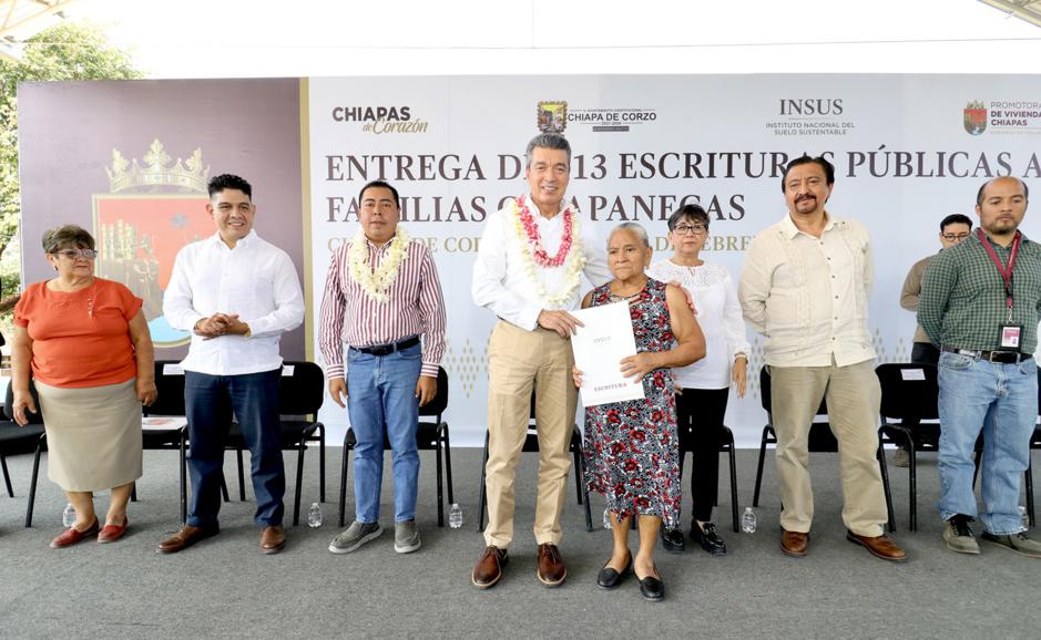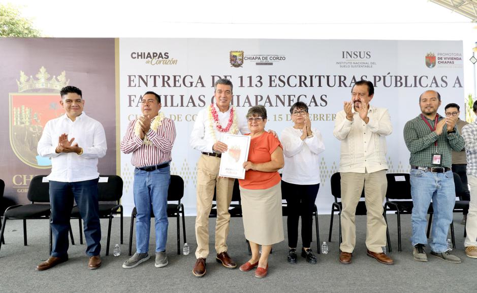 En tanto, la directora general de la Promotora de Vivienda Chiapas, Rosa Marbel Vera Mejía, señaló que esta ocasión se distribuyeron 113 escrituras públicas, documento que además de dar certeza jurídica patrimonial, también facilita el acceso a programas de mejoramiento de vivienda, créditos hipotecarios y trámites testamentarios, entre otros beneficios.