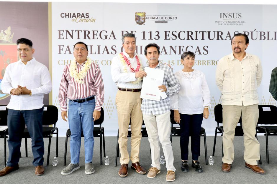 Finalmente, el alcalde de Chiapa de Corzo, Leonardo Cuesta Ramos, reconoció al gobernador por ser promotor de la justicia e impulsor del desarrollo social y económico de la entidad, y expresó que con esta entrega se da bienestar a 113 familias. Refrendó su compromiso de hacer lo que le corresponde para avanzar en la regularización de la tenencia de la tierra, ya que con ello se puede llevar más obra pública y apoyos a la población.
