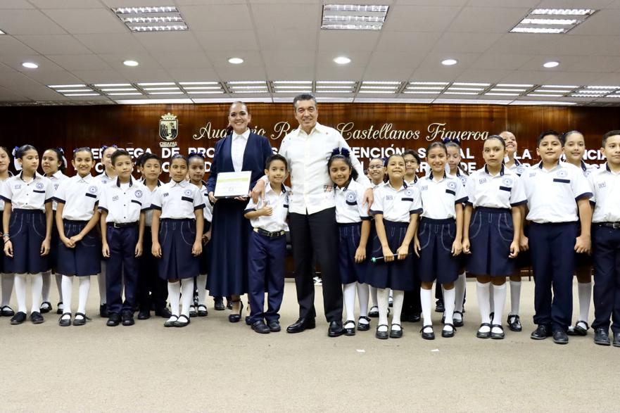 Durante la entrega de insumos de los Programas de Prevención Social de la Violencia, en el municipio de Tuxtla Gutiérrez, el gobernador Rutilio Escandón Cadenas externó su satisfacción de que, a través de Crear es Crecer, Escuela con Valores y Vecino Vigilante, en Chiapas se continúe fomentando la paz social, la tranquilidad y la armonía entre los pueblos, mediante la generación de oportunidades de inclusión laboral, la promoción de la autonomía económica y el fortalecimiento de la convivencia ciudadana.