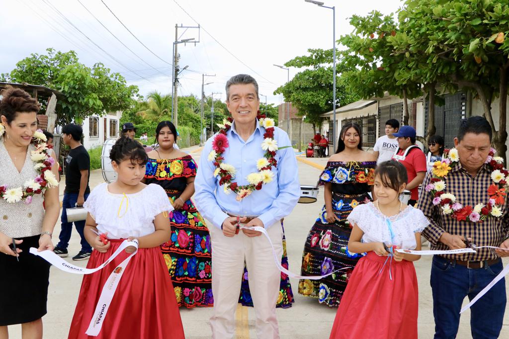 Al inaugurar la pavimentación con concreto hidráulico de la calle Aldama, situada entre la avenida Vicente Guerrero y el CECyTE 47, en el municipio de Huehuetán, el gobernador Rutilio Escandón Cadenas externó su satisfacción de constatar la entrega de esta obra de infraestructura vial, con lo que se cumple un compromiso más con esta localidad, luego de que por mucho tiempo las y los habitantes transitaban sobre una vialidad en malas condiciones.