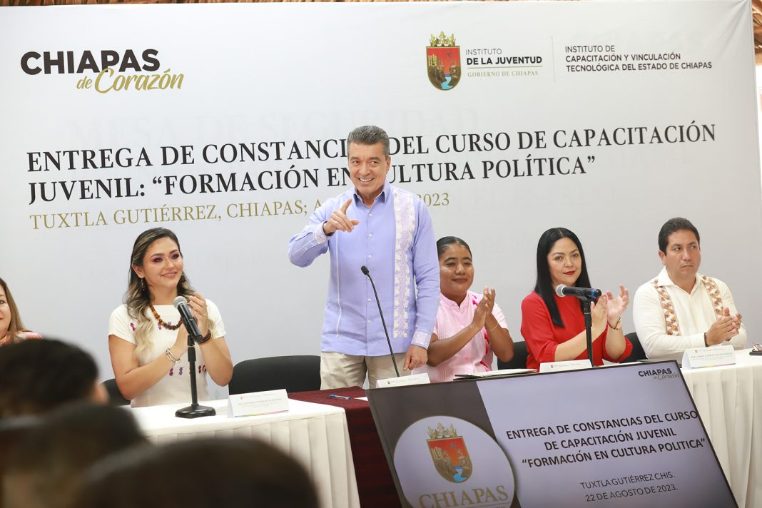 En la entrega de reconocimientos a las y los jóvenes participantes del Curso Formación en Cultura Política, el gobernador Rutilio Escandón Cadenas felicitó a la juventud chiapaneca por el interés de conocer la importancia de la política en el ámbito social, al tiempo de convocarlos a no olvidarse de sus raíces ni de sus principios y valores, así como a seguirse preparando para cumplir sus legítimos sueños y aspiraciones, y ser parte del fortalecimiento del bienestar y progreso de sus comunidades, de Chiapas y México.