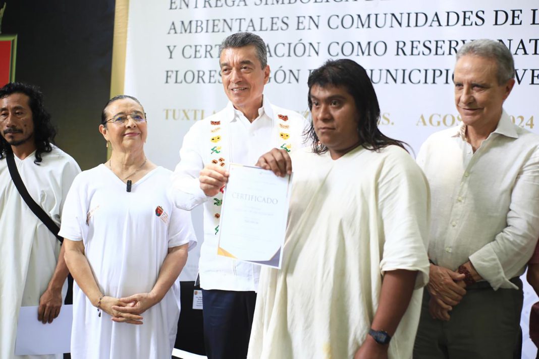 Durante este evento, realizado en el Zoológico Miguel Álvarez del Toro (ZooMAT), de Tuxtla Gutiérrez, el mandatario atestiguó la certificación como Reserva Natural Comunitaria al ejido Ricardo Flores Magón, de Venustiano Carranza, donde reconoció a las y los habitantes por hacer posible la donación de 160.1 hectáreas de territorio para la reforestación y restauración integral, lo que favorecerá al bienestar y el progreso de la Región De Los Llanos.