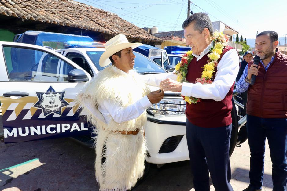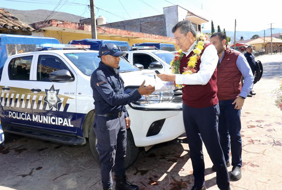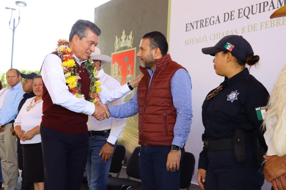 El gobernador Rutilio Escandón Cadenas entregó patrullas, motopatrullas, equipamiento y uniformes a las corporaciones policiales de los municipios de Soyaló, Ixtapa, Bochil, Jitotol, Rincón Chamula, Tapalapa, Rayón y Amatán, donde destacó que, ahora más que nunca, se invierte para que las y los policías cuenten con todas las herramientas y una mejor preparación profesional para garantizar la paz, la tranquilidad, el bienestar y el Estado de Derecho.