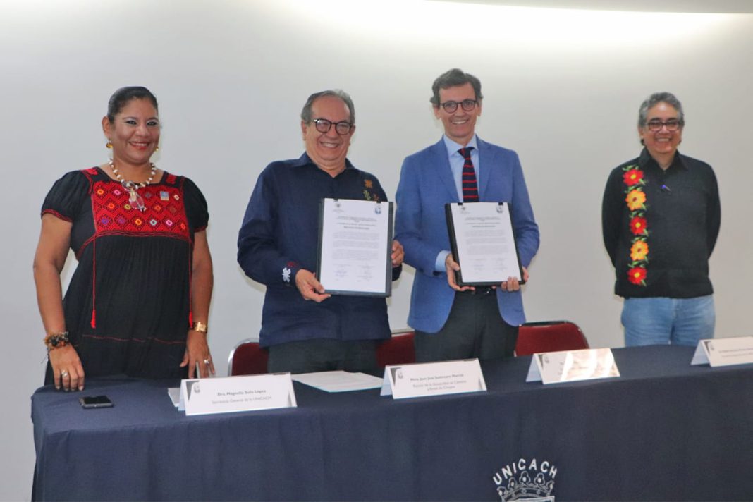 Tuxtla Gutiérrez, Chiapas,12 de septiembre de 2023.- La Universidad de Ciencias y Artes de Chiapas (UNICACH) renovó el compromiso de trabajo conjunto con la Universidad Complutense de Madrid (UCM) mediante la firma de un convenio marco internacional entre el rector Juan José Solórzano Marcial y José Antonio Ruiz San Román, representante del rector de la institución española, en el marco del evento preparativo  “200 años de Historias Compartidas”.