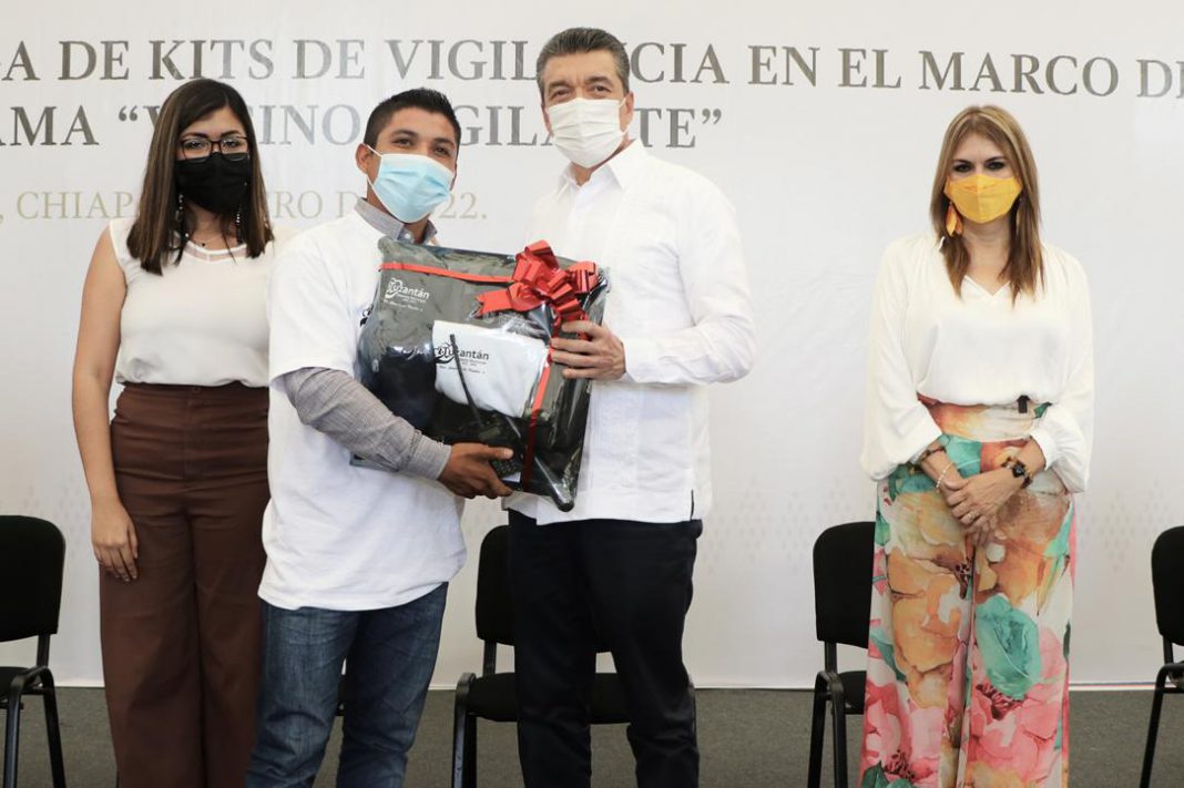 En gira de trabajo por la región del Soconusco, el gobernador Rutilio Escandón Cadenas encabezó la entrega de kits de vigilancia dentro del Programa “Vecino Vigilante”, a los municipios de Tapachula, Tuxtla Chico y Tuzantán, donde destacó la importancia de fortalecer esta iniciativa que coadyuva a las estrategias de seguridad, genera confianza y fomenta la participación responsable de ciudadanas y ciudadanos que voluntariamente participan en la tarea social de vigilar, proteger y salvaguardar la vida y patrimonio propio y de su entorno.