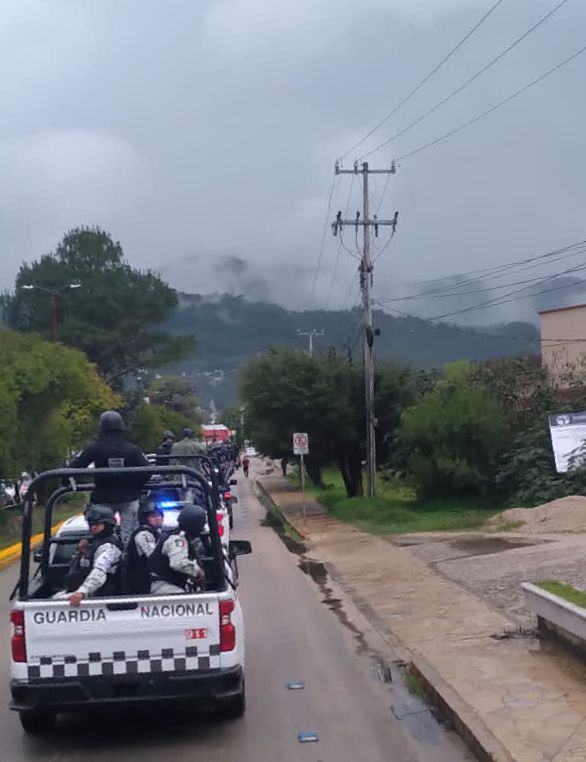 Tuxtla Gutiérrez, Chiapas.- Elementos del grupo interinstitucional conformado por la Secretaría de la Defensa Nacional (Sedena), Guardia Nacional (GN), Secretaría de Seguridad y Protección Ciudadana (SSyPC) y Policía Municipal resguardan el orden público en San Cristóbal de Las Casas, luego de los hechos ocurridos este martes presuntamente derivado de un conflicto social en el Mercado Popular del Norte de esta ciudad.