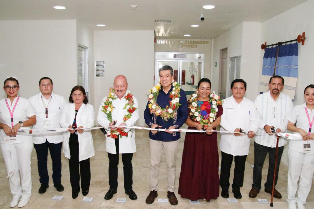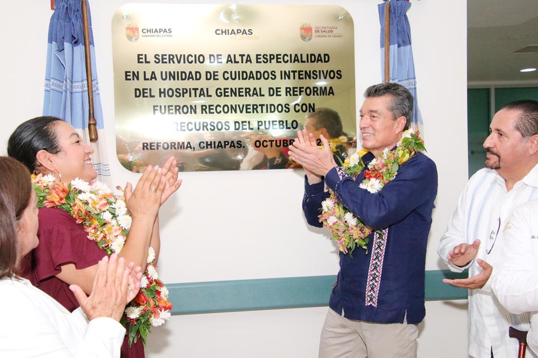 Como parte de las acciones para el fortalecimiento a los servicios hospitalarios de Chiapas, el gobernador Rutilio Escandón Cadenas inauguró la Unidad de Cuidados Intensivos del Hospital General del municipio de Reforma, donde refrendó su compromiso de seguir transformado los servicios de salud e invertir hasta donde sea posible para que las unidades médicas de la entidad cuenten con la capacidad resolutiva eficiente, oportuna y cercana a la gente.