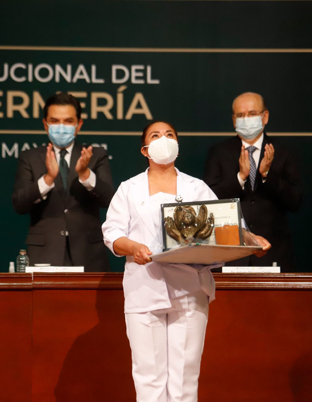 Como parte de la ceremonia institucional por el Día de la Enfermería, se entregó el Premio “Jesús Kumate Rodríguez” a Líderes de Equipos COVID: Ana Karina González Ruiz, subjefe de enfermería del Hospital General Regional (HGR) No. 110 de Jalisco, debido a su destacado profesionalismo, compromiso y liderazgo durante la pandemia.