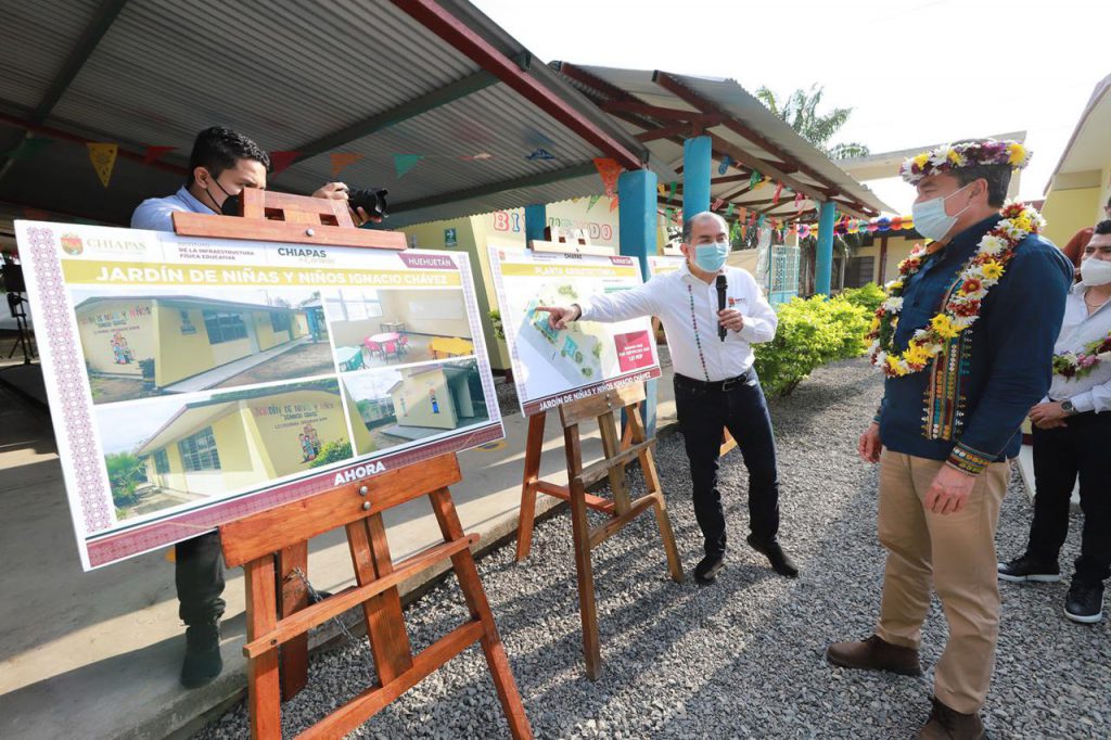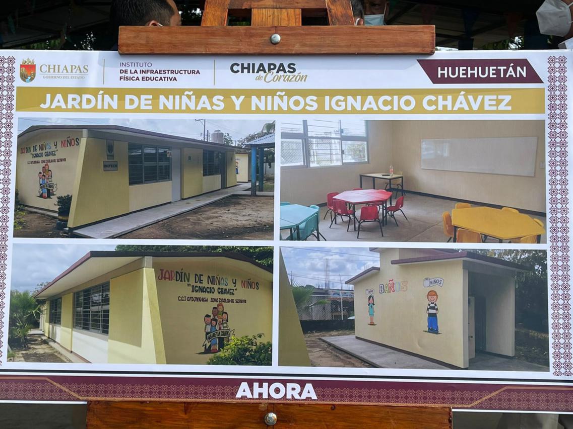 En respuesta a una petición hecha por el personal docente y las madres y padres de familia del municipio de Huehuetán, el gobernador Rutilio Escandón Cadenas inauguró la construcción del Jardín de Niños “Ignacio Chávez”, en donde destacó que con estas acciones se constata el compromiso de la Cuarta Transformación de otorgar a las niñas, niños y jóvenes espacios educativos dignos, seguros y en las condiciones estructurales adecuadas para la impartición de las actividades escolares.