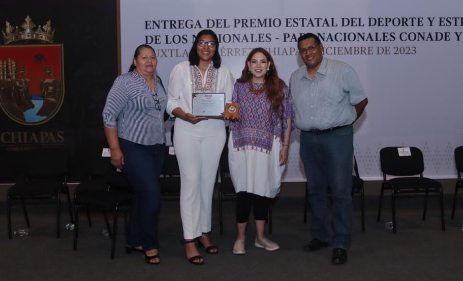 “Me da mucha felicidad y un poco de presión, porque al final de cuenta venimos delante de otras generaciones y tenemos que dar el ejemplo a los que vienen detrás de nosotros”, afirmó Jessica Monserrat Gómez Cruz, al recibir el Premio Estatal del Deporte 2023, entregado por el gobernador, Rutilio Escandón Cadenas, y la directora del Instituto del Deporte, Tania Robles Velázquez.