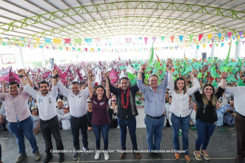 Villa Corzo, Chiapas.- Miles de mujeres y hombres de Villa Corzo entonaron a una sola voz, junto con el candidato a gobernador de Chiapas, Eduardo Ramírez Aguilar, el Himno a Chiapas como mensaje de paz.