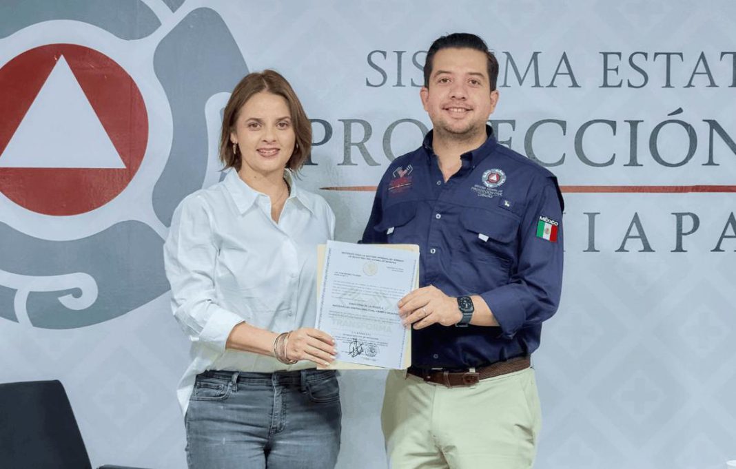 El secretario de #ProtecciónCivil, Mauricio Cordero Rodríguez designó como nueva directora de la Escuela Nacional de Protección Civil Campus Universitario #Chiapas a la Licenciada, Itza Máynes Villegas.