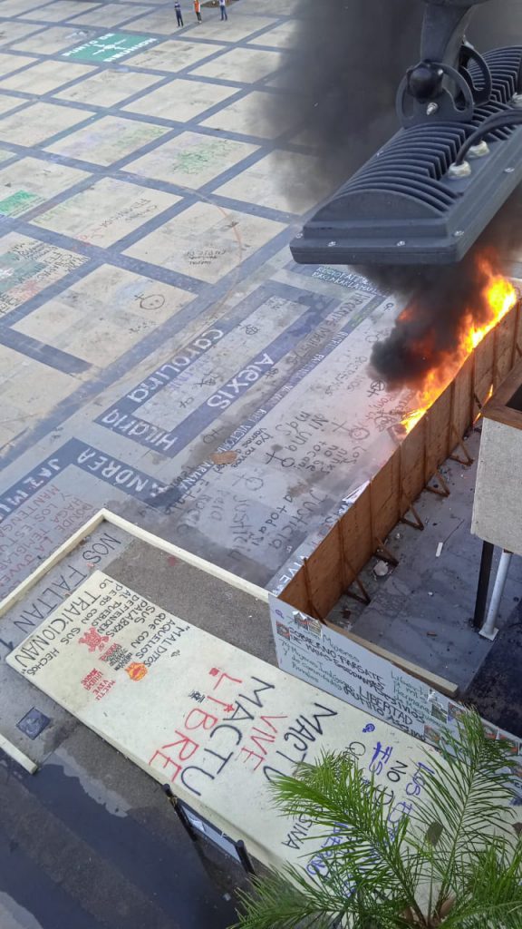 Aproximadamente a las 7:20 horas, los normalistas arribaron al parque central a bordo de distintos camiones; tras colocar tarimas de madera en la entrada de Palacio de Gobierno, arrojaron los artefactos con líquido inflamable, provocando que éstas se incendiaran.