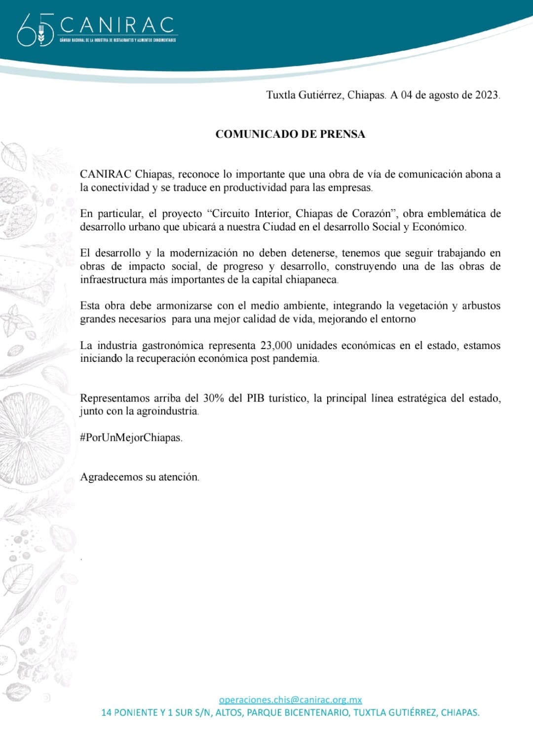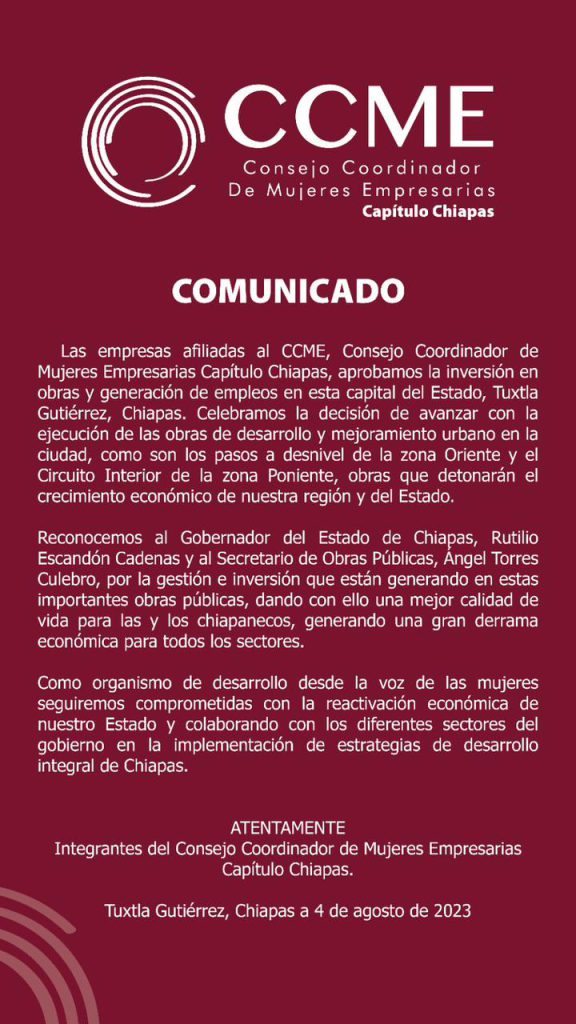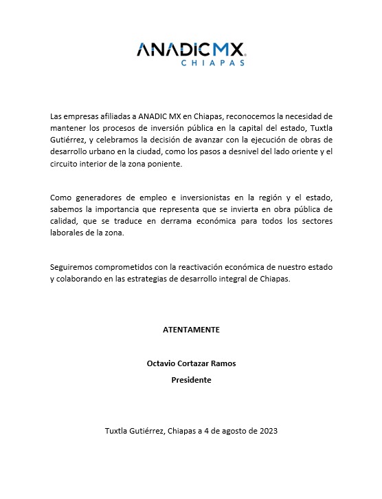 Integrantes de empresas afiliadas a la Asociación Nacional de Distribuidores de Tecnología Informática y Comunicaciones (ANADIC MX), en Chiapas, del Consejo Coordinador de Mujeres Empresarias, Capítulo Chiapas (CCME) y de la Cámara Nacional de la Industria de Restaurantes y Alimentos Condimentados (CANIRAC), celebraron la decisión de avanzar con la ejecución de los pasos a desnivel del lado oriente y del Proyecto Circuito Interior “Chiapas de Corazón”, de la zona poniente.