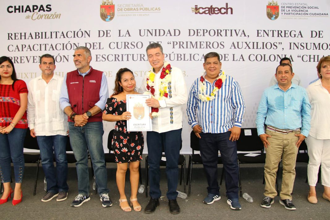 Con el propósito de brindar certeza legal sobre el patrimonio familiar, la Promotora de Vivienda Chiapas (Provich), entregó 50 escrituras públicas a familias de la Colonia Chiapas de Corazón, en el municipio de Huixtla, con base en el Programa de Regularización de la Tenencia de la Tierra que impulsa el gobernador Rutilio Escandón Cadenas.