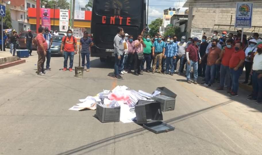 Este lunes, integrantes de la Sección VII del Sindicato y de la Coordinadora Nacional de Trabajadores de la Educación (SNTE-CNTE) Chiapas, realizaron manifestaciones violentas en las instalaciones de la Subsecretaría de Educación Federalizada (SEF), donde rompieron ventanas para sustraer y quemar cajas con documentos oficiales frente al edificio ubicado en la Cuarta Avenida Norte y agredieron a dos integrantes del Departamento de Primarias en el lugar donde se realizaría la cadena de cambios de dicho nivel.