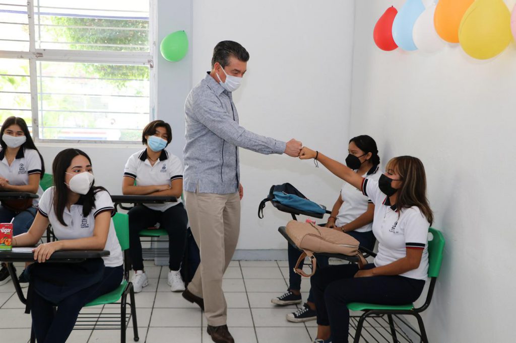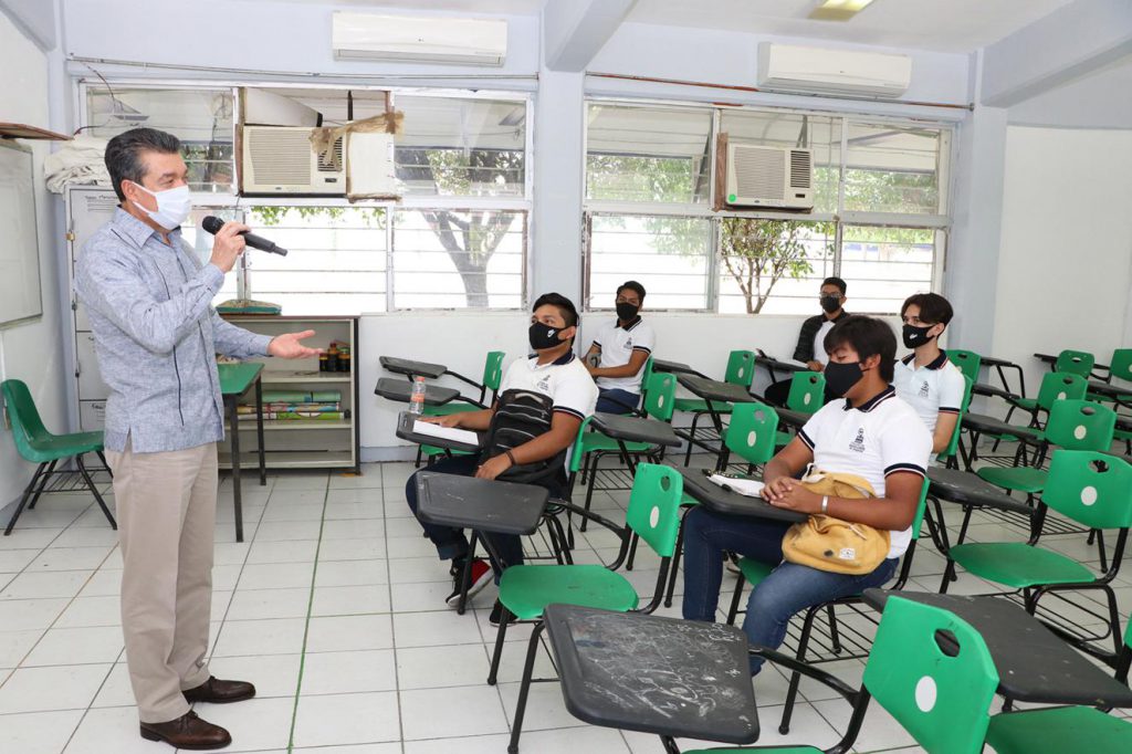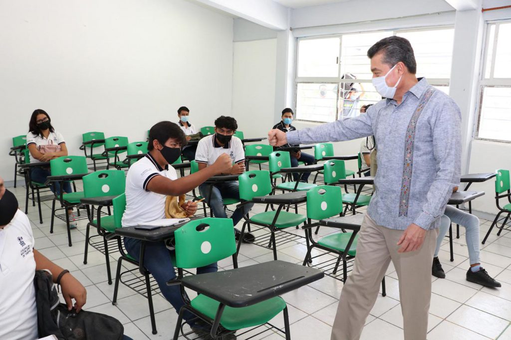 Al constatar la impartición de clases presenciales en este plantel, el mandatario reconoció a las madres y padres de familia, maestras, maestros y estudiantes, que en consenso alcanzaron el acuerdo de regresar a las aulas, sin embargo, les pidió que no se confíen y sigan los protocolos de sana distancia, lavado de manos, no tocarse la cara, uso de cubrebocas y de gel antibacterial.