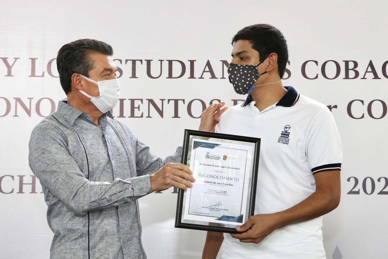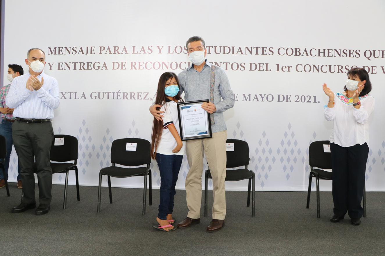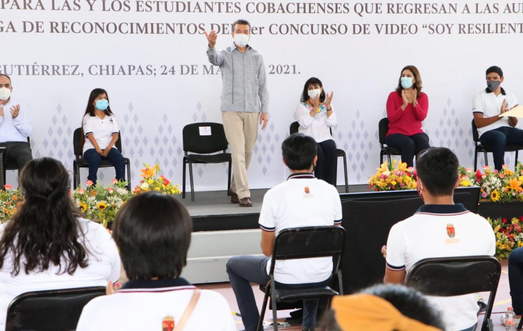 Desde las instalaciones del Cobach 33 en Tuxtla Gutiérrez, el gobernador Rutilio Escandón Cadenas mencionó que la resiliencia acompañará a lo largo de su vida a quien la practique, por ello, dijo que no se dejará de desarrollar este tipo actividades que ayuden a la niñez y juventud a enfrentar distintas situaciones, y felicitó a quienes participaron en este concurso mostrando su talento para llevar un mensaje positivo a sus compañeras y compañeros.