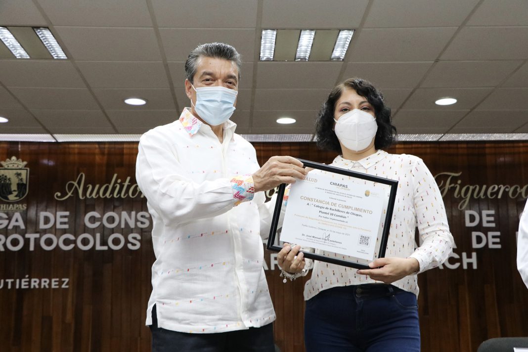 El éxito del regreso a la nueva normalidad es responsabilidad de todas y todos, por lo que se requiere contar con estrategias para resguardar la salud de las personas ante el COVID-19, en este sentido, se entregaron Constancias de Validación de Cumplimientos de Protocolos de Seguridad Sanitaria de los 338 centros escolares del Colegio de Bachilleres de Chiapas (Cobach).