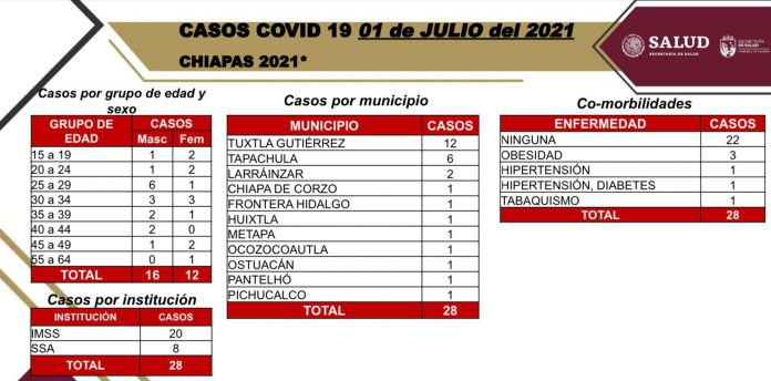 Tuxtla Gutiérrez, Chiapas; 01 de julio de 2021.- El informe diario sobre el comportamiento del COVID-19 en la entidad indica que en las últimas horas se confirmaron 28 contagios, sin que se hayan notificado decesos por la enfermedad.