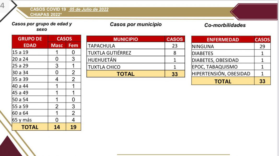 Tuxtla Gutiérrez, Chiapas; 05 de julio del 2022.- La Secretaría de Salud de Chiapas notificó 33 casos nuevos de COVID-19 en las últimas 24 horas, en los municipios de Tapachula (23), Tuxtla Gutiérrez (8), Huehuetán (1) y Tuxtla Chico (1); sin registro de defunciones por esta enfermedad respiratoria.
