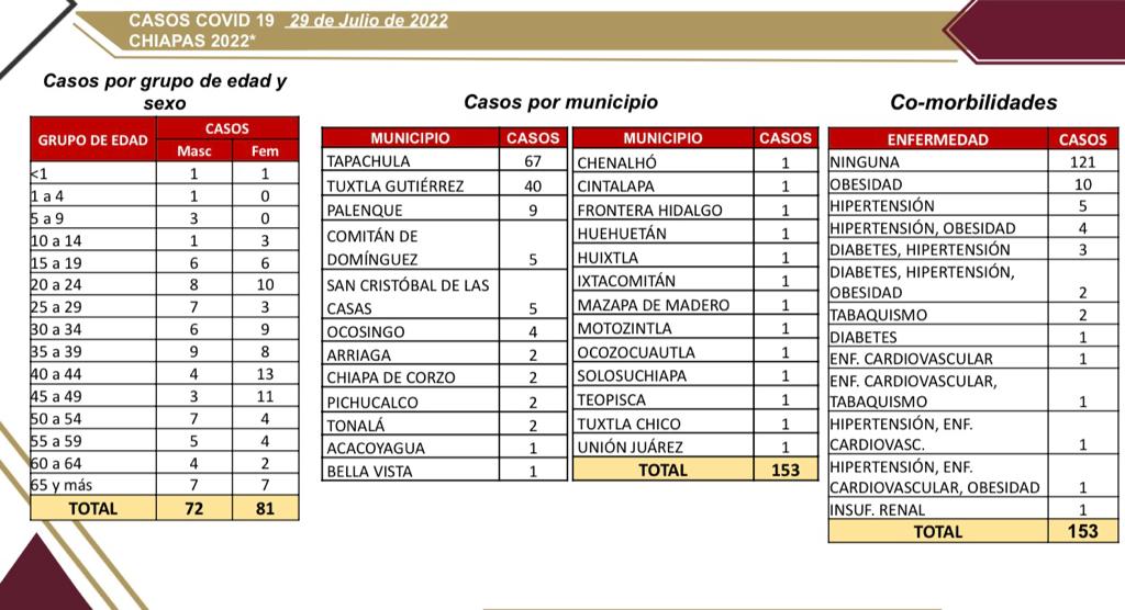 Tuxtla Gutiérrez, Chiapas; 29 de julio de 2022.- El Laboratorio Estatal de Salud Pública confirmó 153 pruebas positivas a COVID-19 en las últimas horas, en 81 mujeres y 72 hombres, da a conocer la Secretaría de Salud de Chiapas.