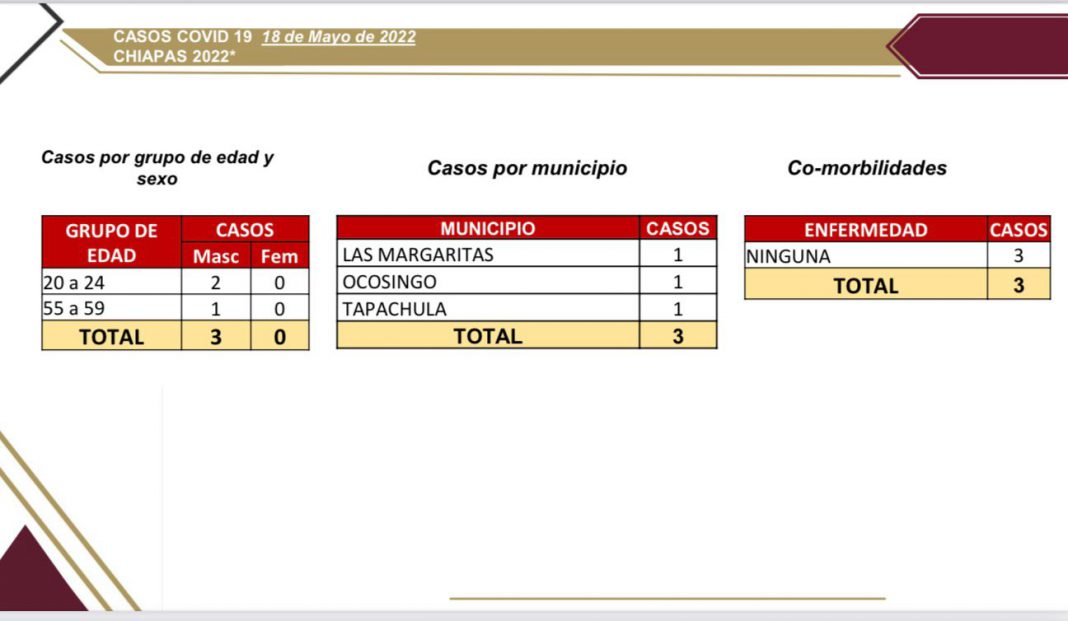 Tuxtla Gutiérrez, Chiapas; 18 de mayo de 2022.- Chiapas reporta tres casos nuevos por COVID-19 en las últimas 24 horas, de acuerdo con el panorama epidemiológico de la Secretaría de Salud del estado.