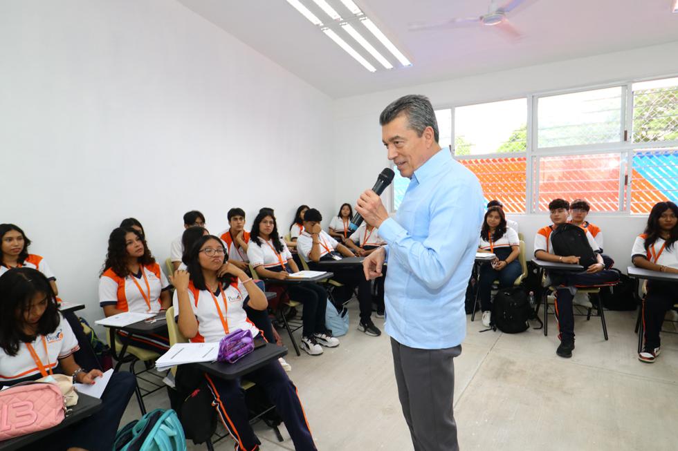 Subrayó que es satisfactorio constatar la entrega de la construcción de siete nuevas aulas, la rehabilitación integral de los edificios de aulas y servicios, el mejoramiento del mobiliario, la reconstrucción de la red eléctrica, entre otras obras que beneficiarán a 748 estudiantes, 35 docentes, directivos y personal de apoyo educativo, así como a las madres y padres de familia de uno de los planteles de educación media superior más emblemáticos de Tuxtla.