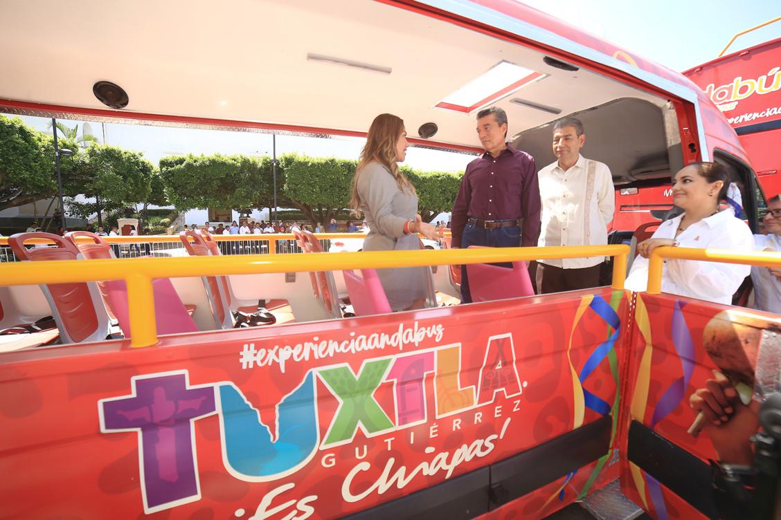 El gobernador Rutilio Escandón Cadenas encabezó el arranque del servicio de transporte turístico Andabus, un nuevo atractivo en Tuxtla Gutiérrez que ofrecerá a habitantes y visitantes la oportunidad de conocer lugares icónicos mediante diferentes circuitos, a la vez que propiciará empleos y derrama económica, gracias a una alianza estratégica entre los sectores público y privado.